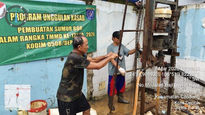 Sementara itu, pembuatan Sumur Bor V di Posyandu Mekarsari yang berada di Jalan H. Saan RT 04 RW 28, Kelurahan Abadi Jaya, Kecamatan Sukmajaya, telah mencapai progres sekitar 90 persen.Pengerjaan sumur bor tersebut dilakukan oleh personel Satgas TMMD bersama masyarakat setempat dengan semangat gotong royong.