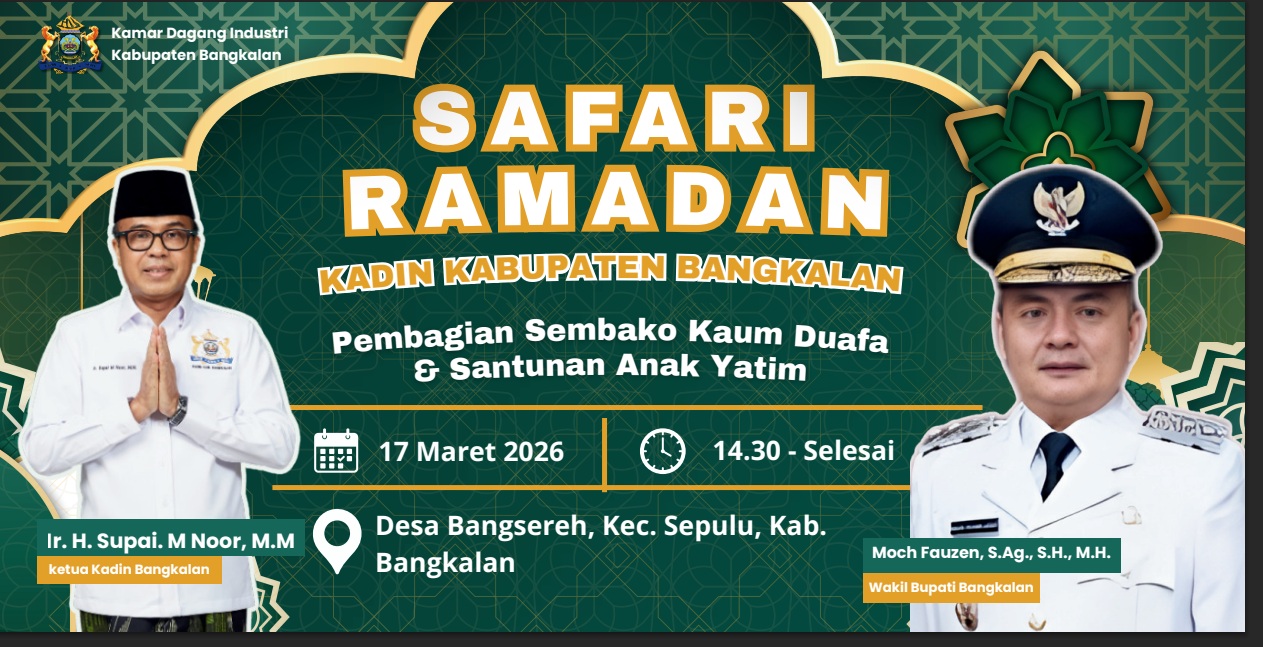 SBCNews.id– Dalam rangka mempererat silaturahmi serta meningkatkan kepedulian sosial di bulan suci Ramadan 1447 Hijriah, Kamar Dagang dan Industri Kabupaten Bangkalan akan menggelar kegiatan Cangkrukan Hukum dan Safari Ramadan yang dirangkaikan dengan pembagian sembako bagi kaum duafa serta santunan untuk anak yatim.