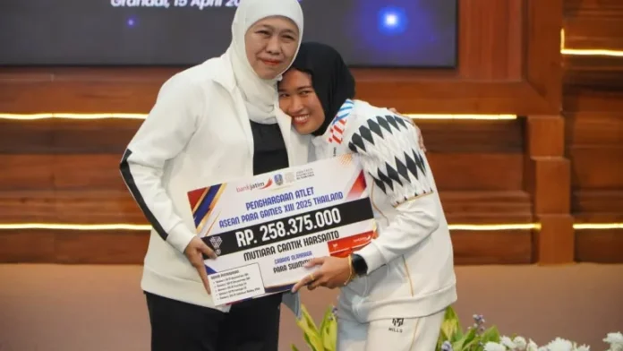 SBCNews.id – Gubernur Jawa Timur Khofifah Indar Parawansa menyerahkan penghargaan berupa bonus kepada atlet dan pelatih berprestasi pada ajang ASEAN Para Games XIII 2025 di Gedung Negara Grahadi, Surabaya, Rabu (15/4/2026).Pemberian bonus tersebut merupakan bentuk apresiasi Pemerintah Provinsi Jawa Timur atas capaian atlet disabilitas yang telah mengharumkan nama daerah dan Indonesia di tingkat internasional.